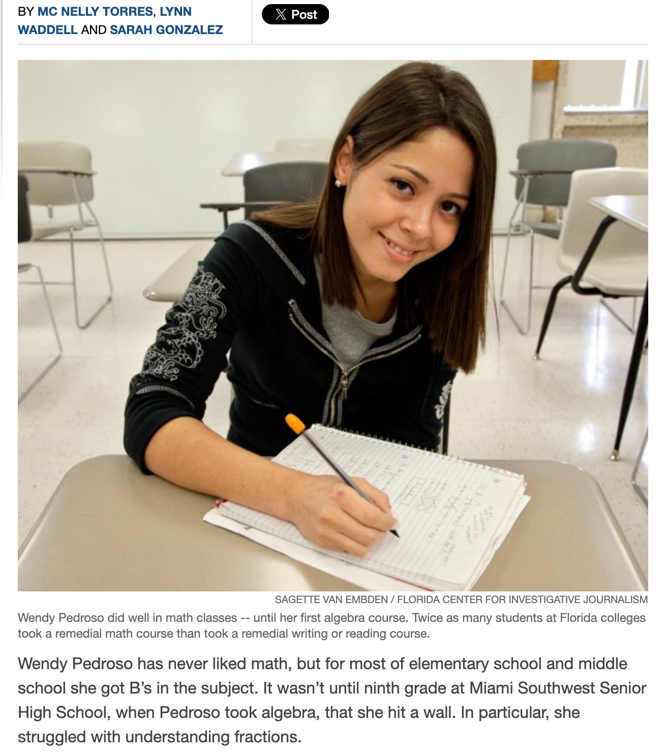 That’s when I met Wendy Pedroso, a student taking remedial math at the Miami Dade College’s campus in Kendall. Pedroso told me that she never liked math but she got B’s in the subject in elementary and middle school. It wasn’t until she was in high school, taking an algebra class, that she hit a wall.